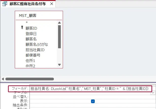 担当社員名: DLookUp("社員名","MST_社員","社員ID = " & [担当社員ID])