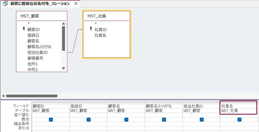 先ほどの2つのテーブルを使って、MST_顧客の情報に、担当社員名を付与したクエリを作成してみましょう。