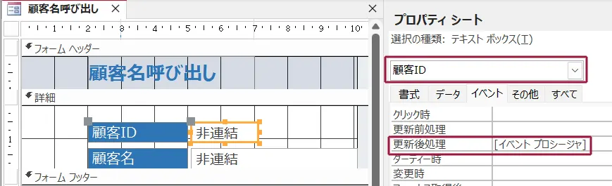 そのため、フォームをデザインビューで表示すると、顧客IDの更新後処理にイベントプロシージャを設定しています。
