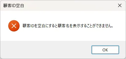 MsgBox "顧客IDを空白にすると顧客名を表示することができません。", vbCritical + vbOKOnly, "顧客ID空白"