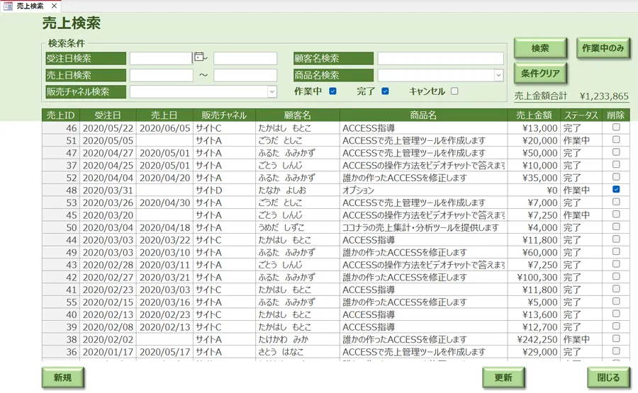 - 受注日、売上日、顧客名ラベルを押すとそれぞれの値でレコードが並べ替えされる