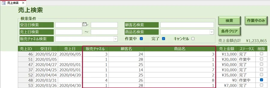 - 検索結果に表示されたレコードのみの売上金額合計が表示される