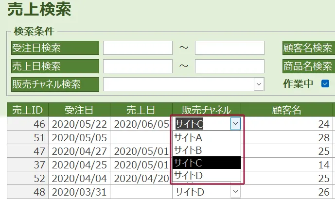 販売チャネルの部分がコンボボックスになり、数値ではなく販売チャネル名が表示されていることが分かると思います。