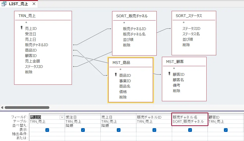 上記の画面では、売上IDや受注などはテーブルが「TRN_売上」を参照しているのに対して、販売チャネル名は「SORT_販売チャネル」から持ってきていることがわかります。