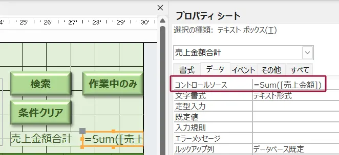 売上金額合計のテキストボックスをデザインビューで見ると以下のようになっています。