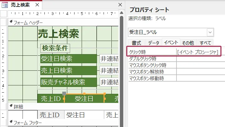 受注日ラベルのクリック時イベントにイベントプロシージャを設定します。