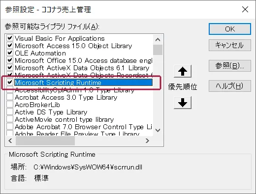 参照設定画面が表示されますので、「Microsoft Scripting Runtime」にチェックを入れ、OKを押します。