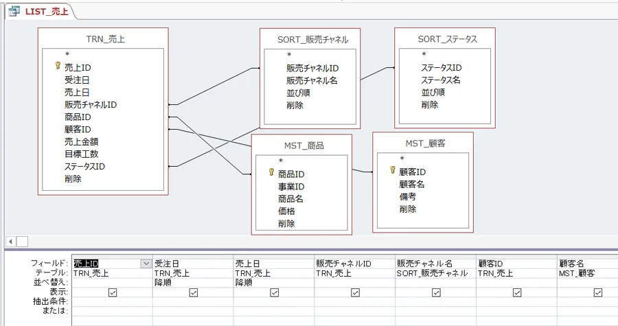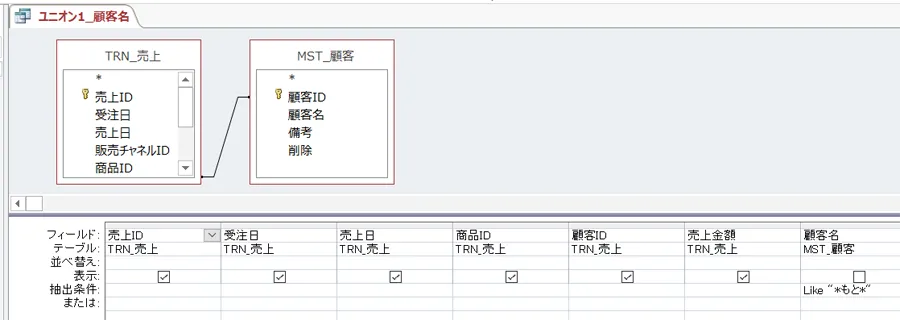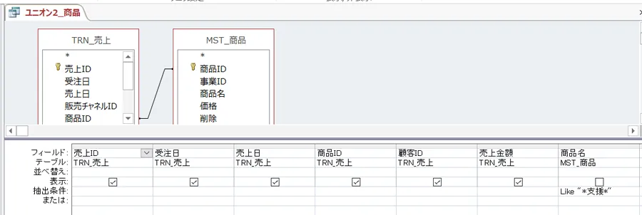 例えば、上記の例でいうと「ユニオン1_顧客名」クエリは抽出条件に顧客名を、「ユニオン2_商品」は抽出条件に商品名を利用しています。