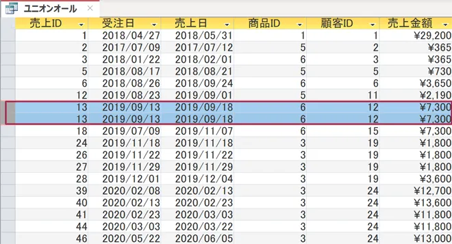 赤枠で囲った売上ID:13が重複していることが分かると思います。