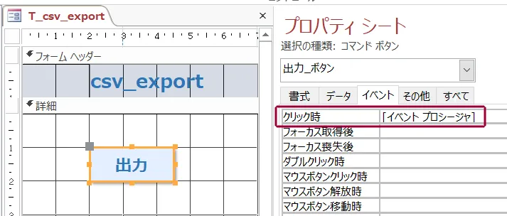 そして、プロパティシートから出力ボタンのクリック時イベントを設定します。