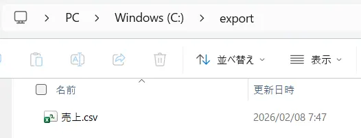 指定したフォルダを見てみると、あらかじめ定めておいた内容のcsvファイルが出力されています。