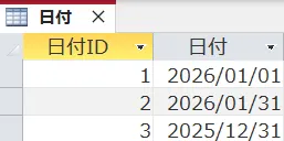 | 基準日の1日前の日付を表示 | DateAdd(“d”, -1, [日付]) | 2025/12/31 |