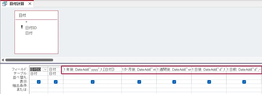 クエリデザインで、以下の日付計算クエリを作成しました。