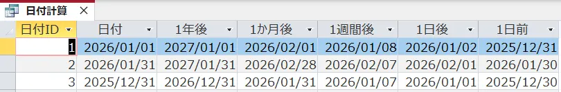 | 基準日の1日後の日付を表示 | DateAdd(“d”, 1, [日付]) | 2026/01/02 |
