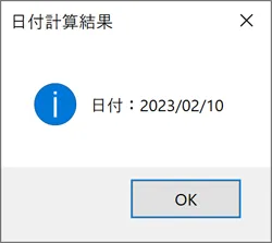 MsgBox "日付:" & hiduke_keisan, vbOKOnly + vbInformation, "日付計算結果"