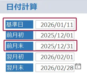 基準日に対して前月末日の日付が正しく表示されています。
