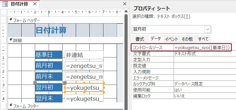 翌月初テキストボックスのコントロールソースは以下の通りです。