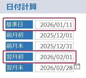 今回は翌月初日でしたが、前月初日や前月末日、翌月末日を求めたい場合は以下の記事もご参照ください。