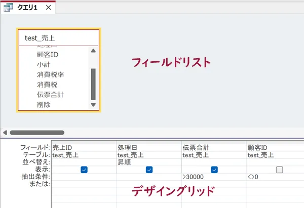 デザイングリッドでは、フィールドリストに表示したテーブルやクエリから任意のフィールドを選択し、クエリに表示したり並び順の設定、抽出条件の設定、さらには集計やその他の演算も可能です。