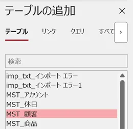 テーブルの追加ウィンドウが表示されていない場合は、上段のメニューから「テーブルの追加」ボタンを押して表示しましょう。