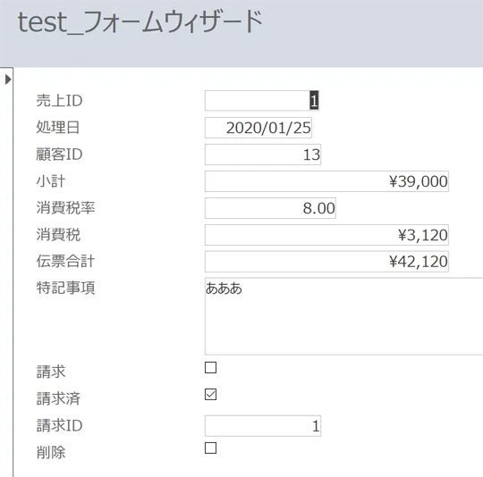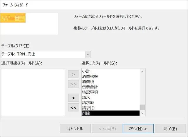 今回は、TRN_売上というテーブルを選択し、そのすべてのフィールドをフォームに表示するようにしました。