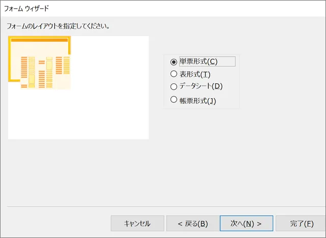 表形式は、複数のレコードを1画面に表示するレイアウトです。検索フォームや集計フォームに適しています。