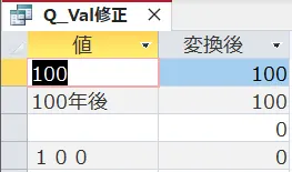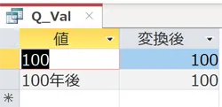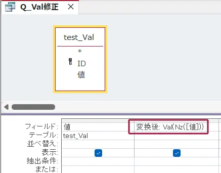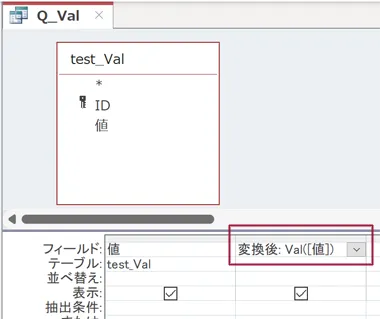今回は、「test_Val」というテーブルを作成し、その中の「値」フィールドをクエリで変換するようにしました。