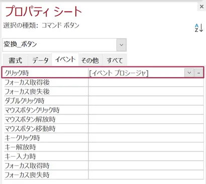 変換ボタンのプロパティシートでは、クリック時イベントとしてイベントプロシージャを設定してあります。