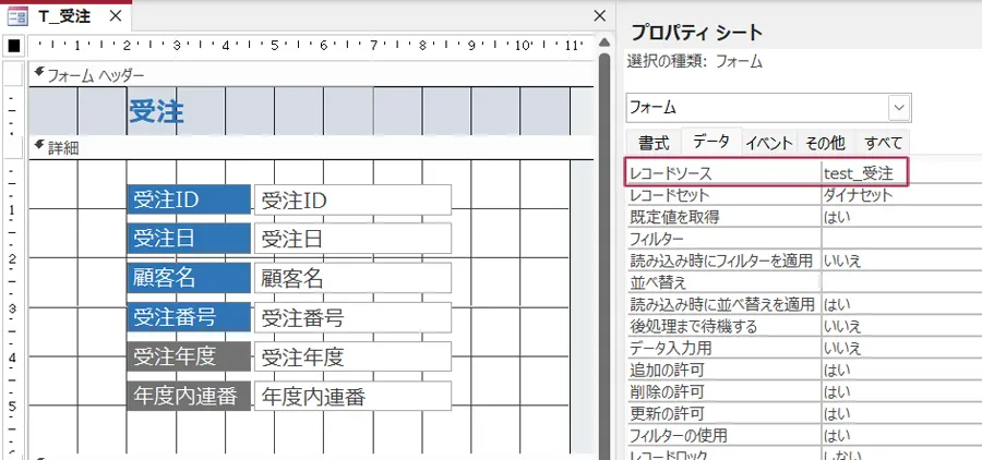 上記の例ではtest_受注というテーブルがレコードソースになっています。