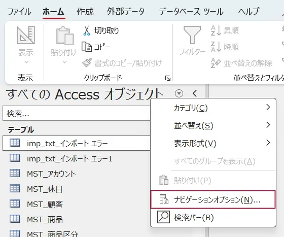 ACCESSの左側に表示されるナビゲーションウィンドウの最上段を右クリックします。