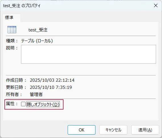 上記のように、少し薄い文字で隠しオブジェクトのテーブルが表示されるようになりました。