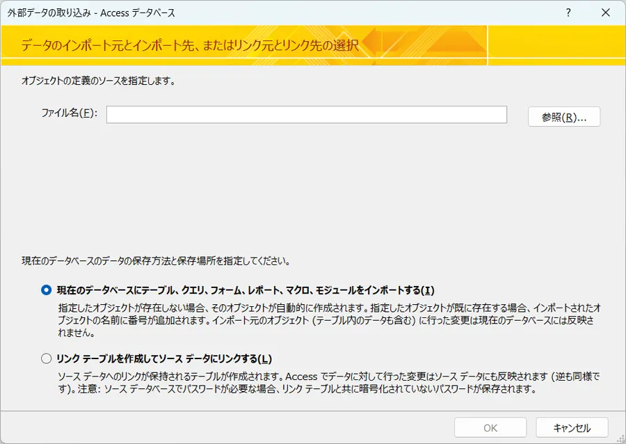 外部データの取り込みが表示されますので元のACCESSファイルを選び、下段で「現在のデータベースにテーブル、クエリ、フォーム、レポート、マクロ、モジュールをインポートする」にチェックをつけてOKを押します。