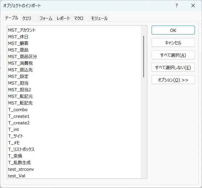 この際、上段のタブでテーブル以外に、クエリ、フォームなども選択することを忘れないように注意ください。