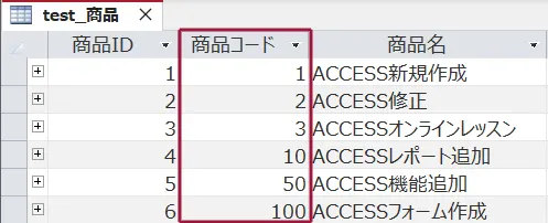 商品コードフィールドには数値が入力されており、桁数がバラバラになっています。
