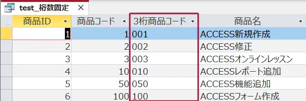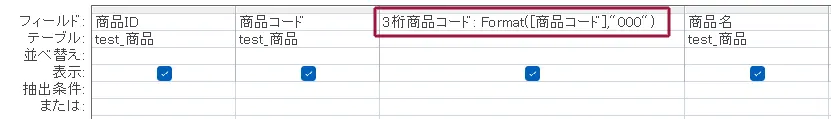 Format関数を使って商品コードフィールドの値を3桁で固定した、「3桁商品コード」という新しいフィールドを作成しています。