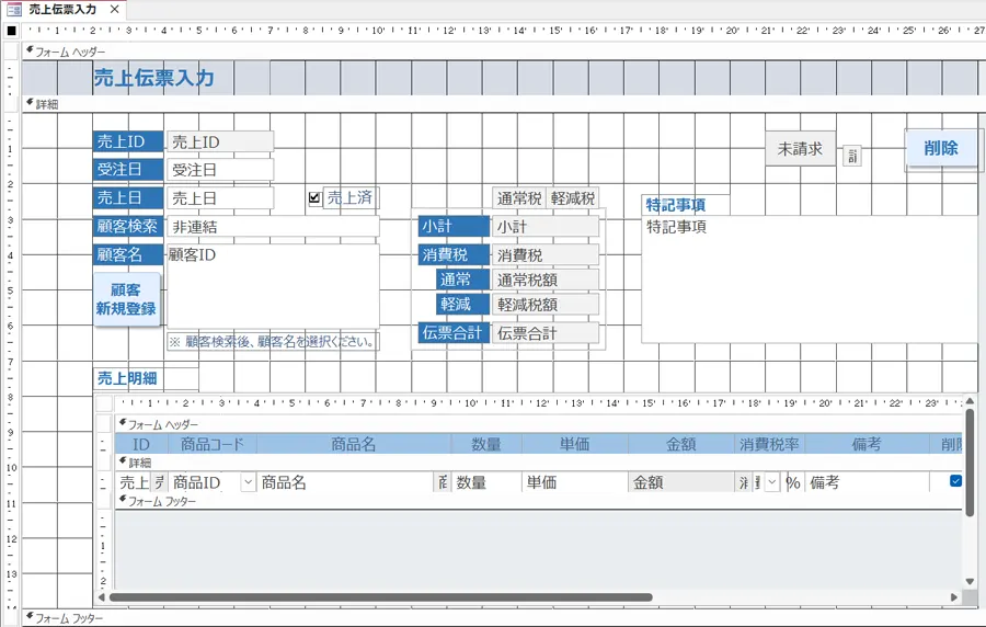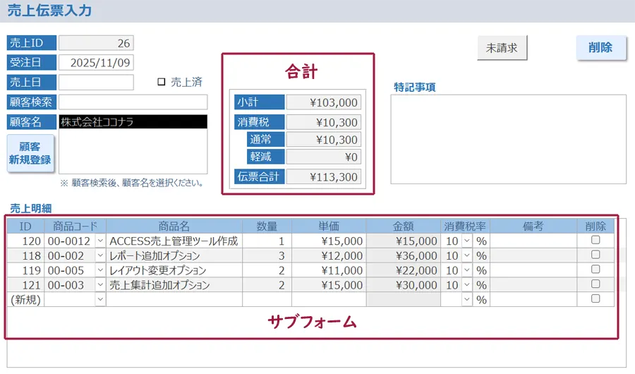 売上伝票本体をメインフォーム、売上明細をサブフォームで作成しています。