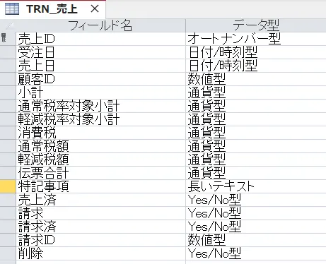 まず、メインフォームのレコードソースであり、売上伝票1枚を1レコードで格納する「TRN_売上」テーブルです。
