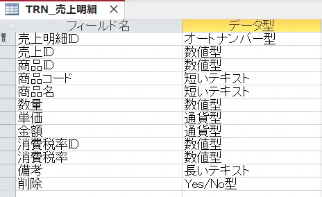 そしてもう一つはサブフォームのレコードソースであり、売上明細1行を1レコードとして保存する「TRN_売上明細」テーブルです。