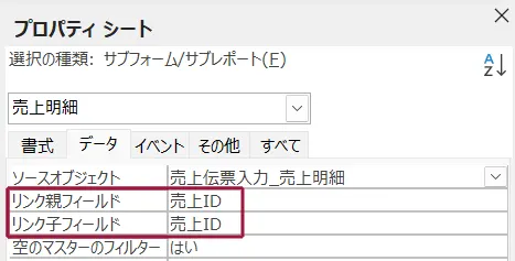 サブフォームとメインフォームのリンクは以下のように「売上ID」を使って行っています。