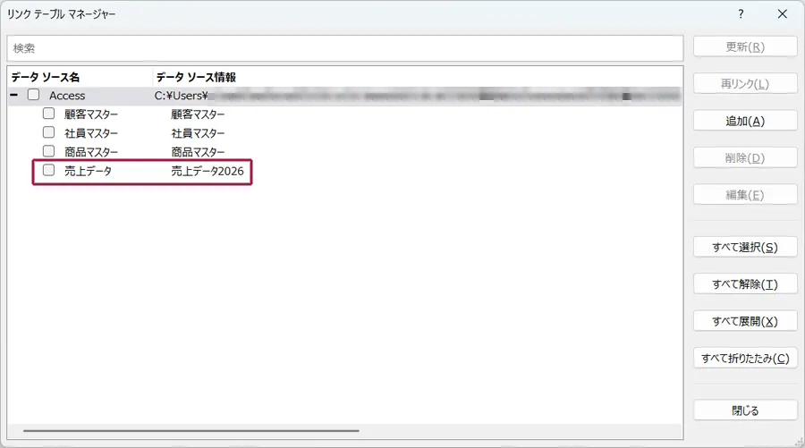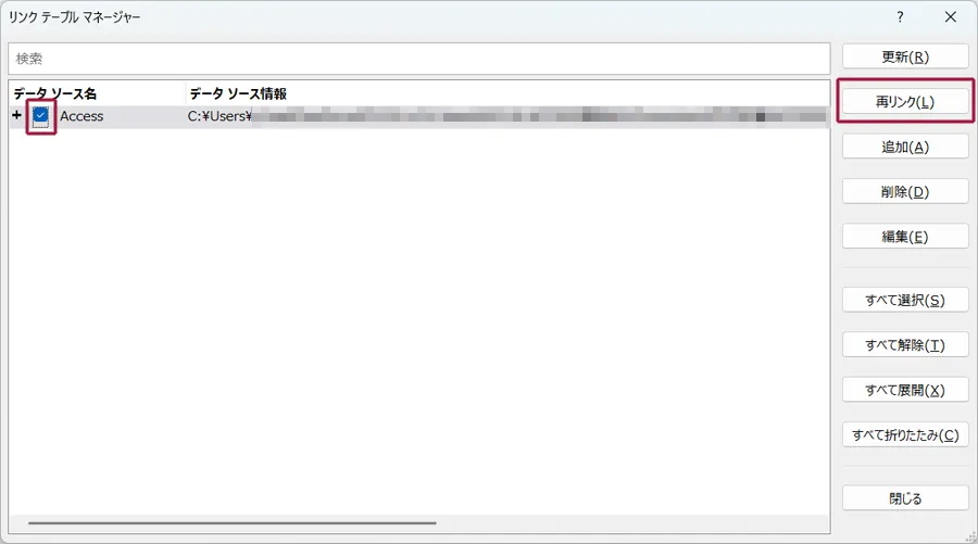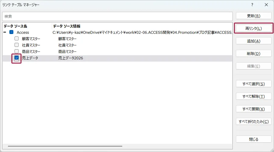 この画面でリンク先のテーブルを変更する際は、データソース名にチェックして、「再リンク」ボタンを押します。