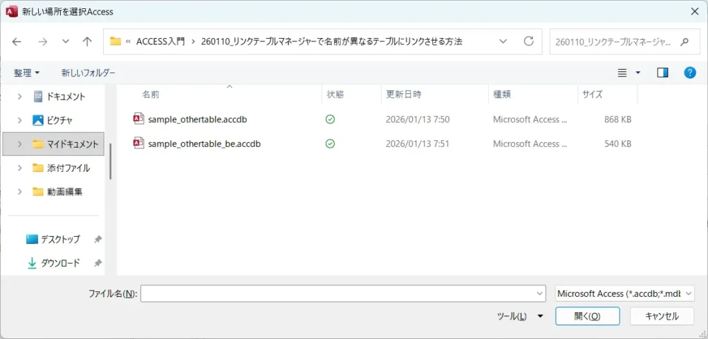 ここでは従来と同じく、sample_othertable_be.accdbのファイルを選択します。