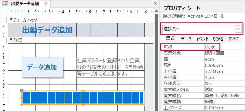 そのため、プロパティシートで進捗バーの「可視」を「いいえ」に設定しました。