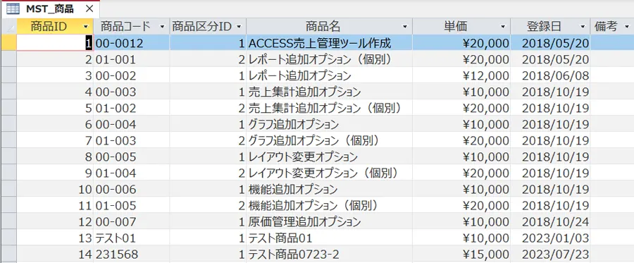 サンプルデータは先ほどと同じ、商品テーブルを使用します。