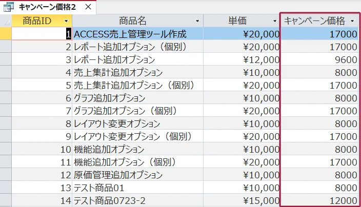 単価はテーブルに格納された値ですので、単価をそのまま書き換えるのではなく、クエリで一時的にキャンペーン価格という新しいフィールドを作成して金額を表示させます。