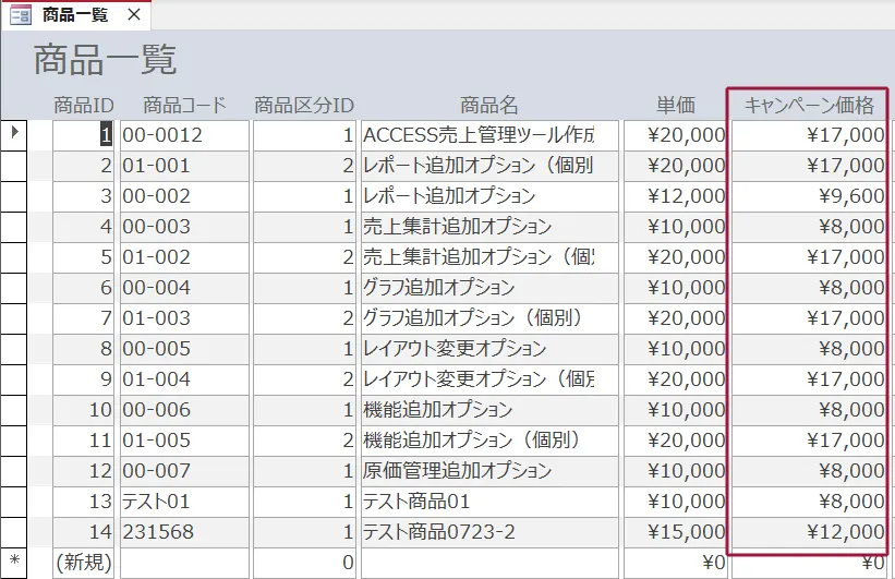 意図した通り、キャンペーンというフィールドが追加され、価格が15,000円以上の商品は、キャンペーン価格が3,000円引きで設定されていること分かります。