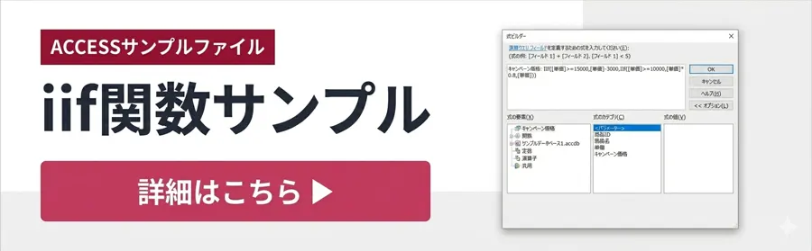 キャンペーン価格: IIf([単価]>=15000,[単価]-3000,IIf([単価]>=10000,[単価]*0.8,[単価]))